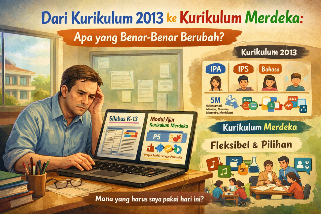 Di suatu pagi di sebuah SMA negeri pinggiran kota, seorang guru sejarah membuka laptopnya dan menatap layar dengan ekspresi yang sulit dibaca antara bingung dan pasrah. Di depannya terbuka dua dokumen: silabus K-13 yang sudah ia hafal luar-dalam selama bertahun-tahun, dan modul ajar Kurikulum Merdeka yang baru saja ia unduh dari platform Merdeka Mengajar. Mana yang harus saya pakai hari ini?